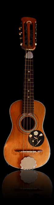 This is not actually my creation, I just saved it from becoming a permanent wall decoration. It's a mandolin from the 20's that I picked up at the flea market in Rome for $10. The body had cracked completely in two pieces all along the curvature. I glued it up, refinished the wood and gave it a new bridge and tailpiece. I put extremely heavy strings on it so that it can be tuned like the top four strings of the guitar, (even at the same octave!)